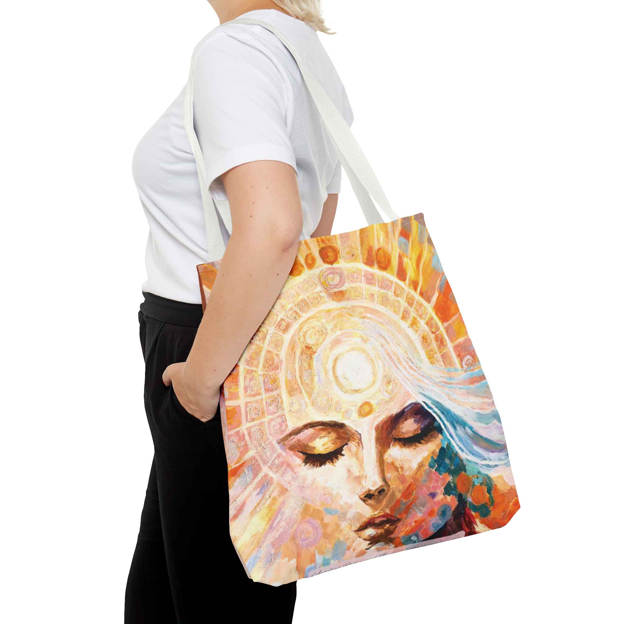 Aurelia Tote Bag er en tote bag med kunst inspirert av Marions maleri Aurelia’s Radiance – et uttrykk for selvtillit, indre lys og den kraften som oppstår når vi tør å skinne vår sanne kraft.